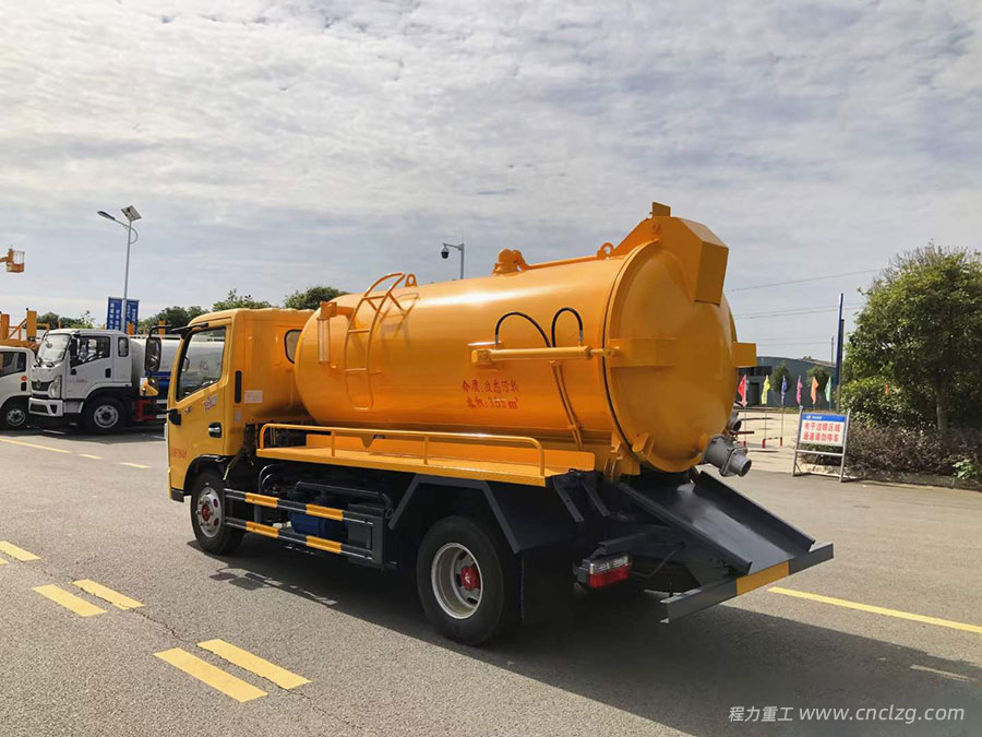 東風D6吸污車上裝配置:罐體容積4.7立方米,采用武鋼優質鋼板制作,安裝山東淄博SK-9水循環真空泵,安裝四通閥,防溢閥,側面帶100的斜抽口,尾部100的自流口,帶舉升功能,后蓋可液壓開啟,尾部2個鎖緊裝置,兩側平鋪放管平臺,帶爬梯,其他標配